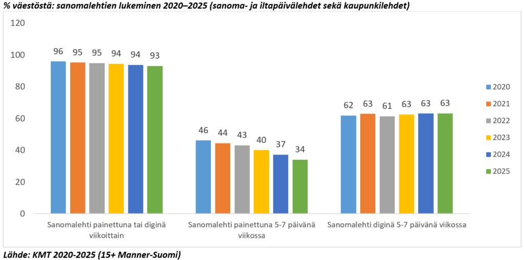 Sanomalehtien viikoittainen kokonaistavoittavuus on 93 prosenttia, digitaalisen sisällön lukemien on osa arkea 63 prosentilla ja painetun lehden avaa lähes päivittäin 34 prosenttia suomalaisista. Maksullista painettua tai digitaalista sanomalehteä tilataan 56 prosenttiin talouksista, se tarkoittaa 2,4 miljoonaa suomalaista.