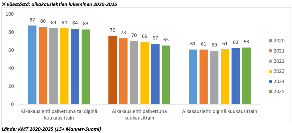 Noin 3,6 miljoonaa suomalaista lukee aikakauslehtiä painettuna tai digitaalisen vähintään kuukausittain. Aikakauslehdillä digitaalinen lehti on jo lähes saanut painetun lehden kiinni kuukausittaisessa lukemisessa, digitaalista lehteä lukee kuukausittain 2,7 miljoonaa lukijaa. Maksettu ja tilattu kotimainen aikakauslehti tulee 44 prosenttiin talouksista eli lähes kahdelle miljoonalle suomalaiselle.