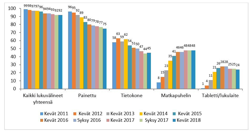 92 % suomalaisista lukee viikoittain sanoma- tai aikakauslehtiä, painettu lehti edelleen digitaalista suositumpi, erityisesti aikakauslehtien lukemistapana KMT seuraa jatkuvasti vuonna 2011 aloitettua trendiä suomalaisten lukemistavoista ja -välineistä. Painettuna lehteään lukee viikoittain 75 % ja digitaalisena 65 % vastaajista. Painettu lehti on lukutavoista suosituin, digitaalisen lukemisen välineistä matkapuhelin ja tietokone ovat Lue lisää